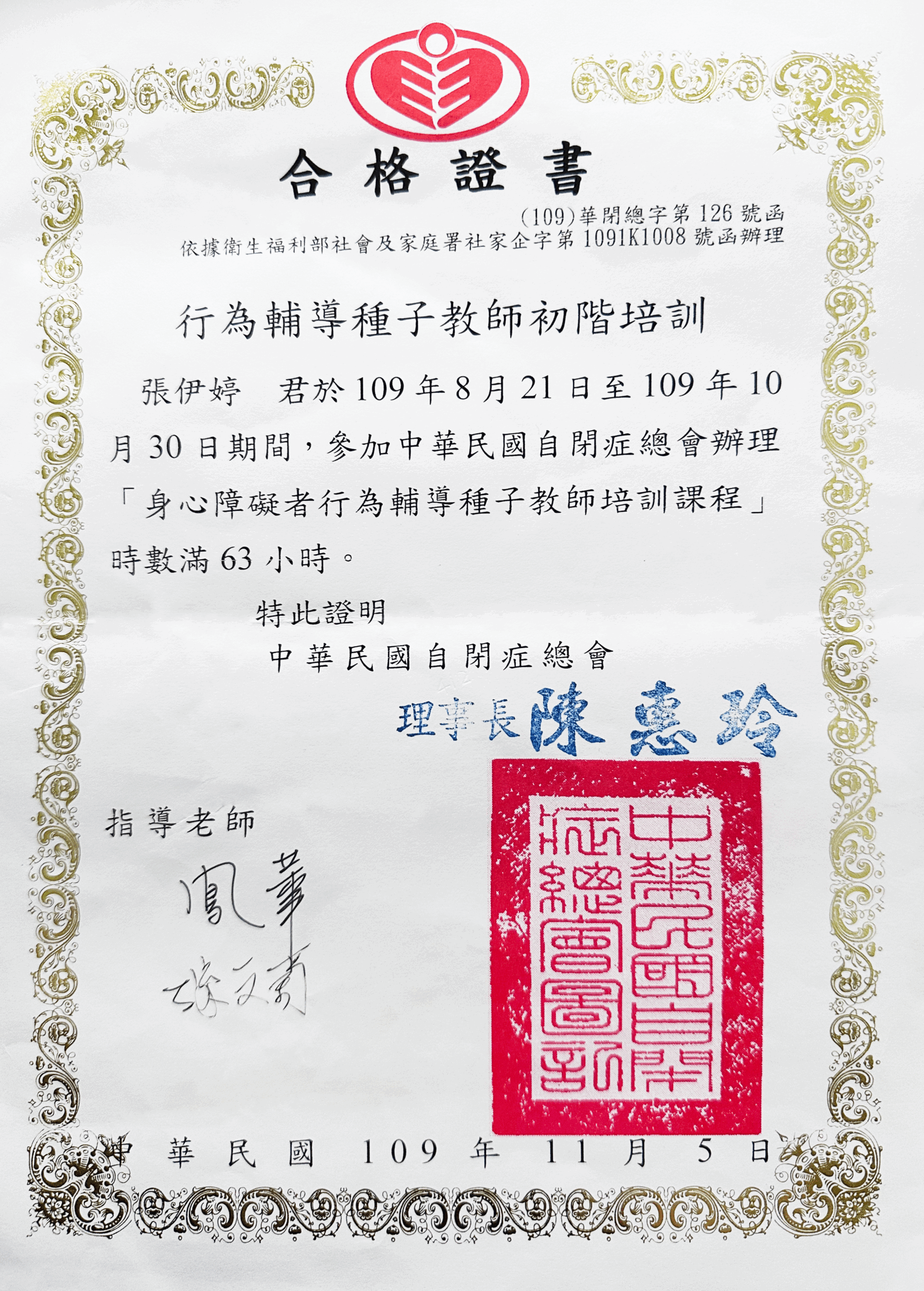 ◾ 長期照護Level 1 證書-行為輔導種子教師初階培訓合格證書