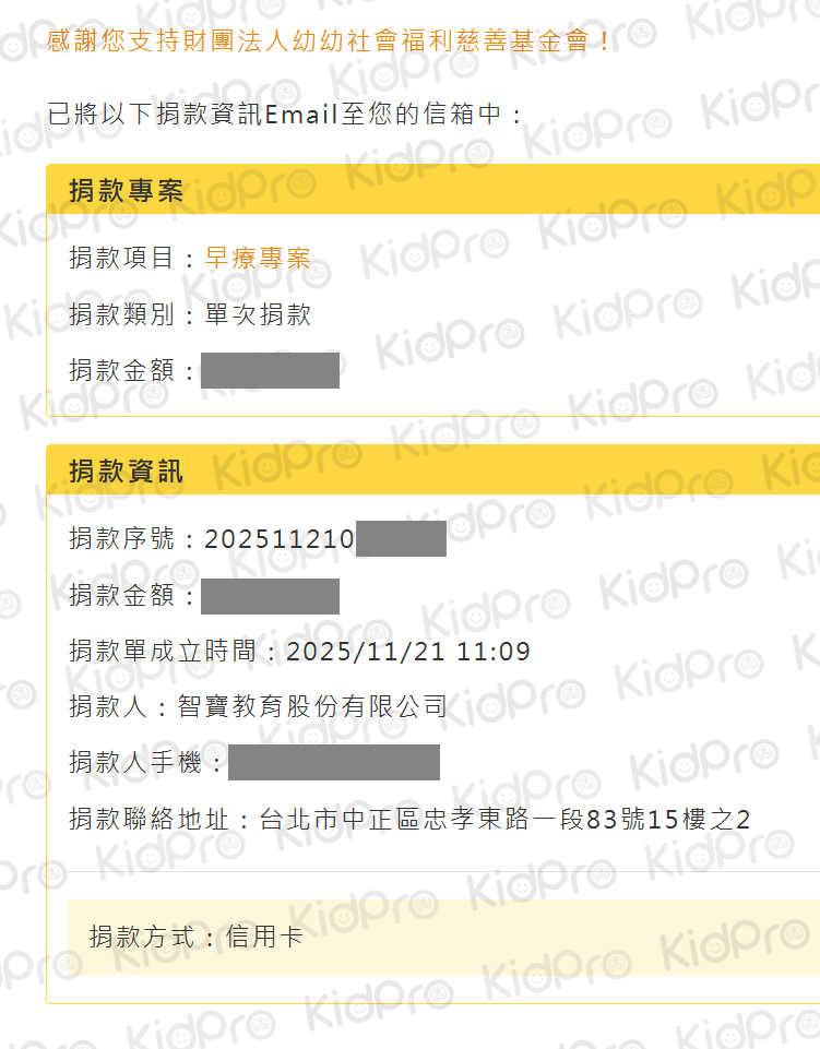 只要於活動期間捐款至「幼幼社會福利慈善基金會」的「早療專案👈」,並將捐款完成的畫面截圖保存(如下方範例),上傳至此「google表單」,即可享有額外課程折扣(適用於0-2 歲父母必修課大全套、2-12 歲父母必修課大全套、全方位口肌訓練課程)。