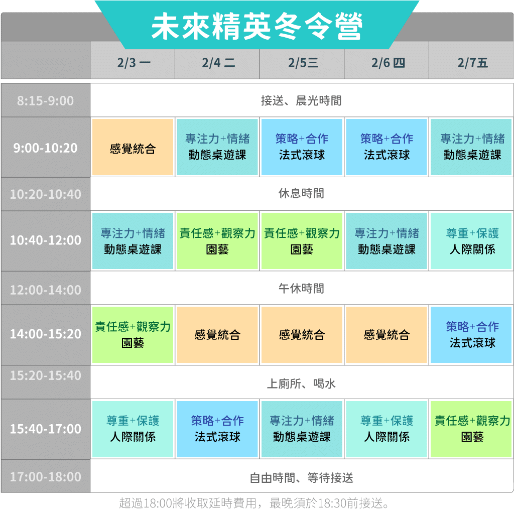 我們安排了:感覺統合、動態桌遊、人際情緒、法式滾球、園藝等課程。